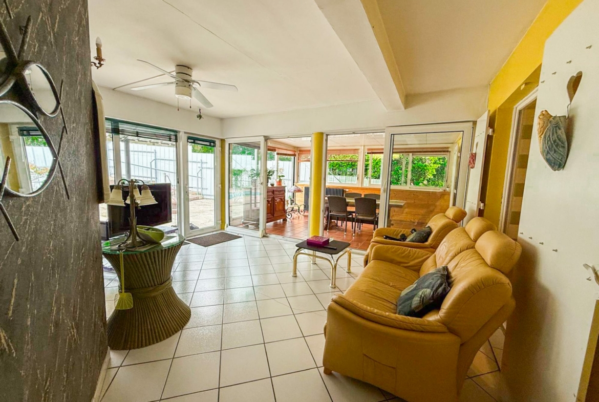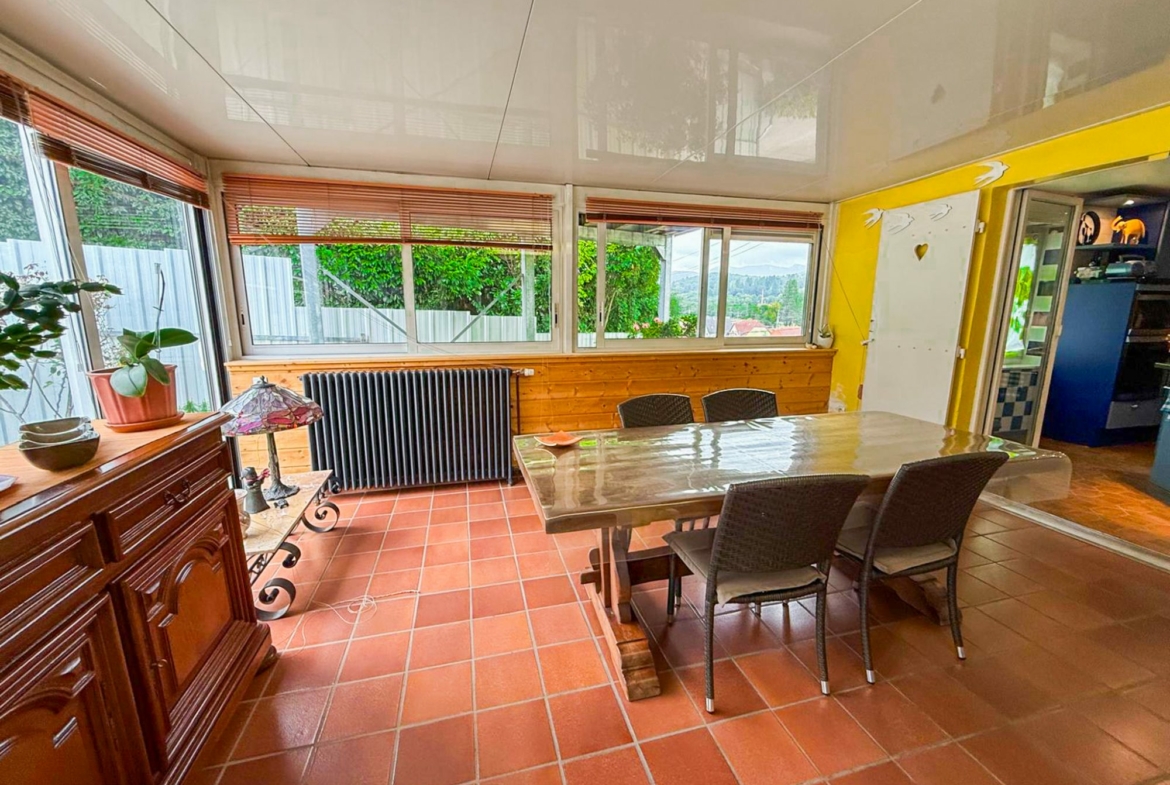 Véranda lumineuse, chauffée et doublement vitrifiée, offrant une vue imprenable sur la piscine, le jardin et les montagnes — un véritable espace de détente utilisable toute l’année